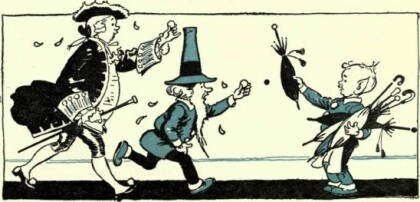 tree—when, as every one knows, it rains all around if it rains at all, not just in one small place! This is puzzling! I must inquire into it! "The King sent the Lord High Chamberlain down to see into the matter. The Chamberlain, who was a very rich and grand man, most beautifully dressed in cloth of gold, stepped down the palace drive to the gate. Then he walked haughtily to the big tree that stood by the gate.Pip was still there. He saw the Lord High Chamberlain and grinned. My goodness, if only he could make him buy an umbrella or a sunshade— he would buy the finest one in the whole shop!He tipped up a watering-can—pitter-patter, down went the water! The Chamberlain was most astonished and annoyed. Could it be rainingafter all? He looked up at the tree.And he saw Pip's naughty, cheeky face peeping there! He knew at once what had been happening. He commanded the frightened pixie to come down and he fetched Chuckle too. Holding them by their big pointed ears he took them back to the palace with him." These pixies watered every one who passed by, so that they would go and buy umbrellas," said the Lord High Chamberlain in an awful voice." Is that so? " said the King, also in a verystern voice. " Then I make a law in futureThe Chamberlain was a veryrich and grand man.that nobody in the whole of Fairyland shall buy anything from these two bad pixies. You may go, pixies."They went, crying bitterly. They knew that they would have hard work to make a living now, for nobody would buy from them. Poor Pip and Chuckle!But they soon found a job with the dandelions, who were very good to them. Do you know what they do? Guess! Yes—they make those beautiful little parachutes that are fitted to every dandelion-seed! Find a dandelion-clock and take the seeds into your hand. You will see that you have dozens of little parachutes there, made of the finest hair. Blow them into the air and see how well they fly!