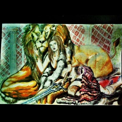 Saxon woman warrior and her fierce lioness. Roar! XD
