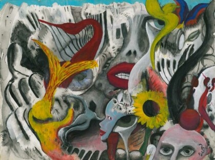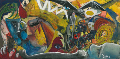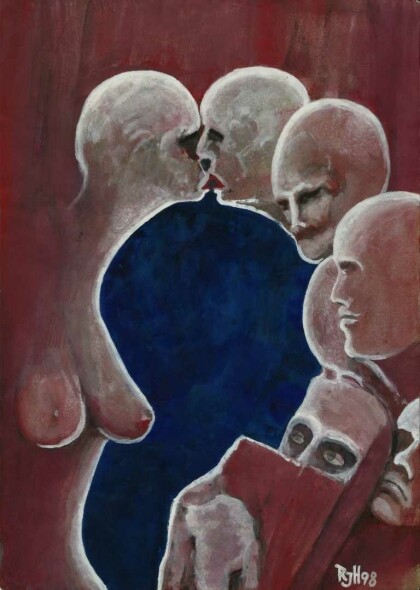 The First Kiss - Double picture or picture puzzle. The blue background is, surrounded by pale figures, a stylized silhouette of a head of a boy. Gouache on paper, 1998, 20,8 x 29,3 cm.