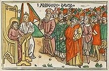 Woodcut from Anton Koberger's Bible (Nuremberg, 1483): The angelically inspired Saint Matthew musters the Old Testament figures, led by Abraham and David