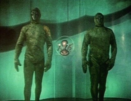 It was probably a week or so after that, on a Saturday, when I was over with the Maggia family and watching a black & white sci-fi movie about a flying saucer landing in the field behind a boy’s house and capturing the townspeople and replacing them one-by-one. It was truly corny by today’s standards. You could even see the zippers on the backs of their alien costumes! But, after the movie was over, I grabbed my bike and crossed the street to go home. It was already dark and I had to put my bike away in our garage. I opened up the garage door, and standing within the garage was THREE small gray men with big heads and black oval eyes standing right across form me! I slammed the garage door back down, forgot about my bike and ran to the front door to tell my stepfather that there were Martians in our garage. Hey, it was 1958 and what else would a boy think it was back then?