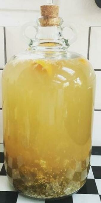 Add the mixture (peaches juice) and warm water into the fermenter. Don't forget 2 cups raisins, 2cups honey and cup of lemon juice. Mix well all the ingredients together and cover the fermenter with airlock before adding yeast.