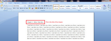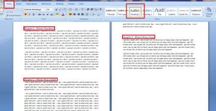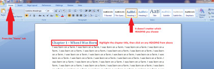 Make sure you are on the “Home” tab in Microsoft word. Highlight only your chapter title and then click on a Heading from the tool bar above. It doesn’t matter what Heading you choose. The standard format will transfer to the epub file of your eBook. See example.
