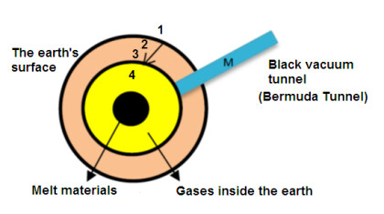 We said under the Bermuda Triangle is the deepest place of the ocean. That is the nearest one Earth distance to the point of peak black vacuum pressure at point 4 of Fig. A. In this form, a black vacuum cylinder or tunnel is formed that the black vacuum extended to the void vacuum. In this black vacuum tunnel or Bermuda tunnel: there is no weather but there is a very strong gravity force, from the black vacuum towards the void vacuum. In the air as dust and in the water as a whirlwind it rotates but in the sky is invisible. This black vacuum tunnel absorbs whatever is in the water, on the water, and in the sky by itself. Surely sea fish like animals and dying birds before the occurrence predicts it. This tunnel absorbs everything rotationally and it's better to say this swallow is so fast that it's any reaction from the victim and even he does not know where he is. This black vacuum acts like the black space hole and everything absorbs everything rotationally.