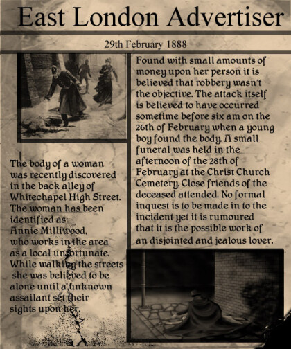 Its pouring down with rain, an open grave can be seen in the middle of Christ Church Cemetary. There is only a few people at the graveside of Annie Milliwood. The Unlucky Unfortunate who met her untimely end at the whitechapel high alley way. Stabbed by a clasp knife in the lower torso and leg area.