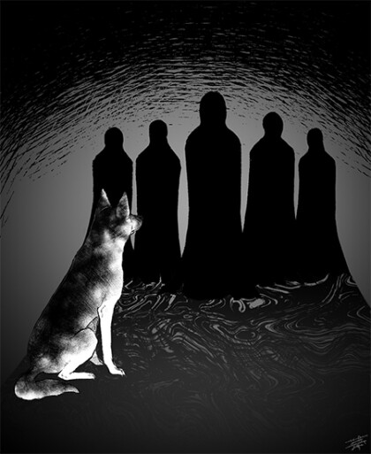 It is before dawn and the air is cold and crisp. Among the hurrying masses our friend takes a detour to dispose of his empty bottles when he is startled by a stray dog that is rummaging around the garbage bin. The dog aproaches our friend but is instantly shunned "go away". It was a beautiful German Shepherd and smart enough to know our friend wasn't in a friendly mood so it went back to rummaging in the dark.