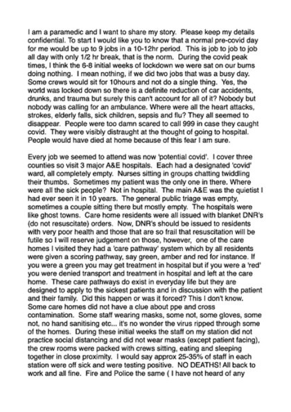 Read the following story from a Paramedic which shows you how we have been manipulated and whole countries locked down for no reason. Here is the Paramedics story: