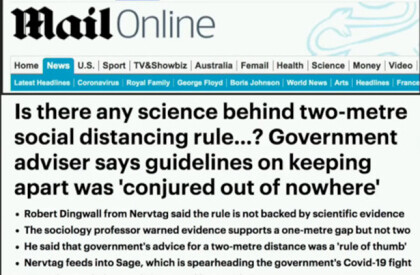Another of the baseless COVID assumptions is that all this social distancing or physical distancing is backed by solid scientific evidence. It’s not. Whether it’s 6 feet, 1.5 meters or 2 meters, the virus seems to be able to jump different distances depending upon what country it is in. The fact is there is no scientific evidence to support the disastrous two-metre rule.
