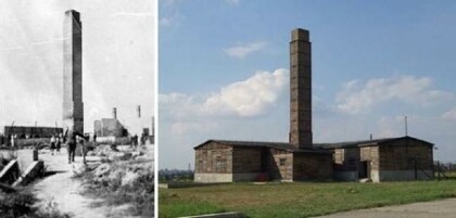 The whole building was rebuilt by the Russians after the war and a gas chamber has been added. The tourists who are shown around building are not told this was all built after the war. The photo below shows the camp in 1943 and the camp in present day.