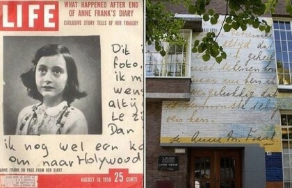 Below on the left Ann Franks own handwriting and on the right a plaque which supposedly displays a page of Ann Frank’s diary in the Ann Frank School in Amsterdam. Obviously the one on the right is not Ann Frank’s handwriting, does it look like the handwriting of a 15 year old, no.