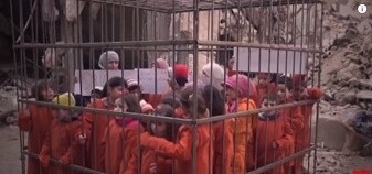 Below a picture of children placed in a cage in Douma by the Jaish al-Islam rebel group who are being funded and trained by Israel, America and Britain.