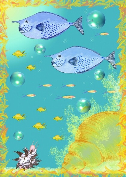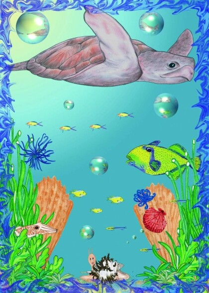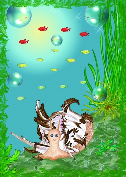 Suddenly a scallop shot past Luna from the left. It looked as if she was moving in reverse. Luna was shaking her feelers all confused, never before had she seen anyone swim backwards, when something obscured the light from above. Luna looked up and saw a giant turtle swimming past the gate to the underwater meadow. The turtle seemed to float weightlessly like a bubble. And then the current suddenly carried the delicious flavour of algae tickling Luna‘s osphradia.