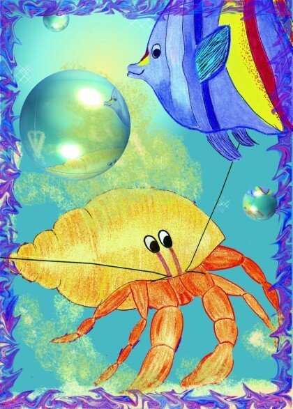 When you came around the coral I was about to eat.“ Bernhard stepped from one leg to the – others and Luna realised he did not want to be disturbed while eating. “Bernhard, it was very nice to meet you! But now, I must be on my way to the underwater meadow. Bernhard, too, bid his farewell and watched Luna as she slid off. Luna turned back to wave to Bernhard with her tentacles, Bernhard lifted one of his claws and waved back.