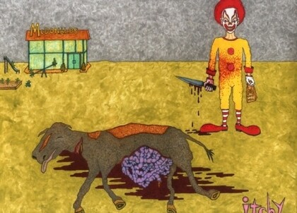 it is difficult to comprehend the sheer violence of past events. ah so, my day ends, after starting a new and rather disturbing painting, it is ronald mcdonald, the world´s favorite flesh-devouring clown, standing over a butchered sick cow with its intestines spilling out on the ground, and there is a bloody butcher´s knife in ronald´s hand. a nice comment for all my flesh eating friends out there. it is so appropriate that mcdonalds uses a clown to lure and entice children to eat that shit meat that mcdonalds serves to ten billion assholes a year. get the kiddies eating flesh nice and early, disregarding the sanctity of life in the formative years before their minds can fathom how wrong it is to feed off the death of animals to keep their own bodies alive. yeah, use a clown to suck the stupid children into your sick venal trap, mcdonalds. wealth, prestige, power, and importance, you can have it all. and when you can afford to eat at mcdonalds every night, you will not only be eating like a real american, you will look like an american: a big ugly fat disgusting pig. i´ll have a big mac, fries, and a coke. SUCK SHIT YOU EATERS OF FLESH. die the tens of thousands of deaths you inadvertantly caused by eating dead animals to keep your sorry ass alive. well, it´s time for bed now; enough ranting and raving from me, it´s time to dream.