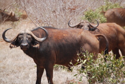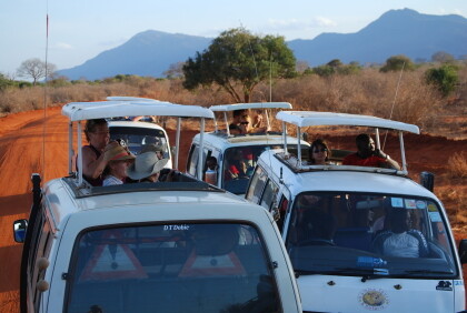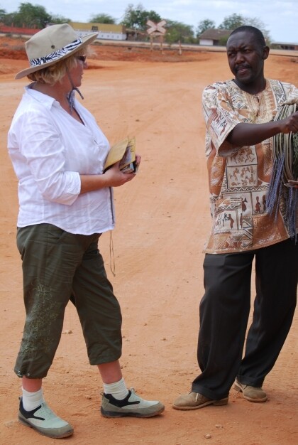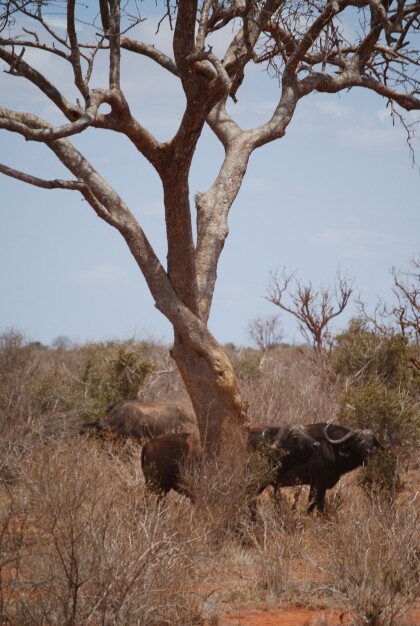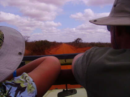 At 10 o'clock and a relaxed drive from our hotel at Diani Beach on the Indian Ocean ( Kenya), we arrived at our destination of our dreams : the park located southeast Buchuma gate of Tsavo East National Park. We were probably the only two visitors and immediately there came some native people ; they entangled us intensively in a conversation. One spoke of the necessary sunglasses (antidust) and a head covering because of the sunlight. For the latter, he offered a bunch of safari hats for sale . So JUTTA and the other passengers came to their head protection. Since our trip to India in 2007 I am the owner of a very practical safari hat that I have not taken even before the Taj Mahal.
