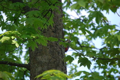 On 8 May 2013, there was already a very pleasant temperature of 15 deg. C to the fish ponds and nature showed its most beautiful colors. I discovered several birds in the bushes and tried to take sharp photos. This task was not easy . First, a great spotted woodpecker, which confused me, because the first time I heard his hammering and then he was gone. This time, I managed to photograph his outline behind the leaves .