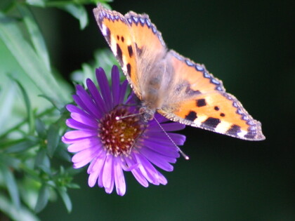 Mid-August 2013, I discovered on the wall (where the ball flowers bloomed) a colorful butterfly which bears the distinctive name "Little Fox." He has also found its place in my photo book "Bunte Schmetterlinge in schöner Landschaft".