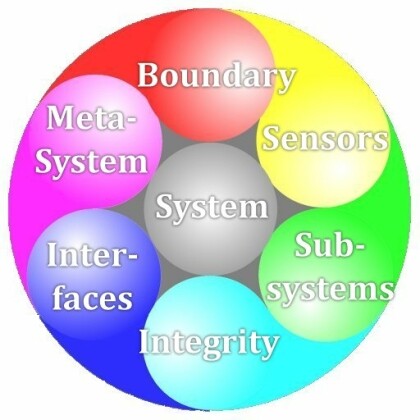 Basically, the Subsystems are what the System is made up of. This also includes the way these various parts are connected together. It is in the green sphere because normally, we can depend on the parts being there, right where they are supposed to be. On the other hand, it doesn't hurt to make sure of that fact, so we add the light blue sphere, named Integrity. This is in fact the System inspecting itself to make sure it is still in one piece, kinda like you look into the mirror before driving to a date with your friend....