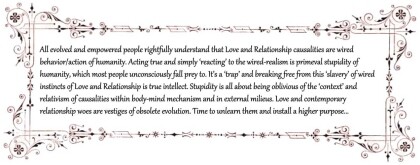 In any case, what humans, especially young men and women need is ‘Compassion’ and not ‘Passion’. What we all need for life-living wellness and excellence is not Love but empathy of thoughts and equanimity of consciousness. This alone makes us endowed and empowered to rise above ‘drives’ and ‘visceral traps’, to consciously choose the path of righteous options. We have little choice – We all need poise and control, never indecisive optionlessness of body and mind. Unlearning the viscerality of love to learn the artistry of conscious compassion is a must.