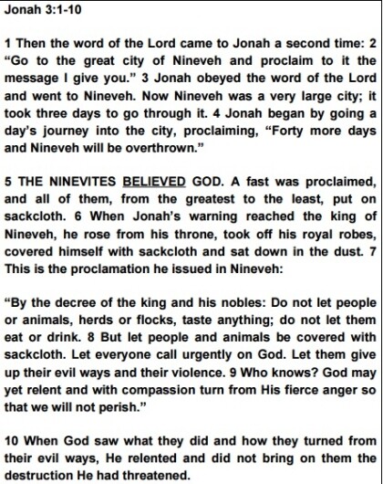 Because the Ninevites truly believed God about the judgment that God threatened them with, the Ninevites then truly repented of their evil ways. Notice also that the Ninevites repented even without being sure if God would spare them. They were just hoping God would spare them. The Ninevites truly feared God, and believed God, and as a result obeyed God.