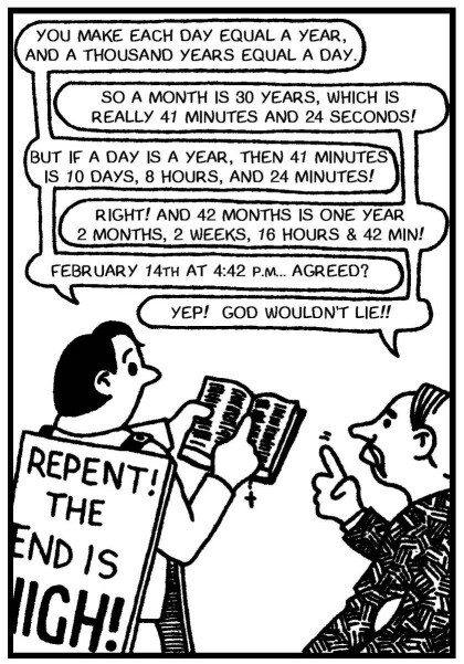The Year 2000 theory was an example of this. The Bible says that time is nothing to God: "A day with the Lord is as a thousand years, and a thousand years as a day." (Psalm 90:4) We know God made the world about 6,000 years ago, in just six days, and then he rested on the seventh day. Neither of these two isolated truths is prophetic. They just say the obvious: that God can do more in one day (e.g. create human life) than we could do in a thousand years.