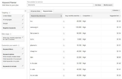 As you can see from the “televisions” data return, there is a large number of searches and high competition. Also, pay close attention to the Suggested bid price when using the Google Keyword Planner.