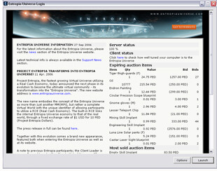 As well as allowing you to log into the Entropia Universe, the Login Window allows you to view the latest Entropia Universe news, quickly check current auction data, and adjust various computer performance Options.