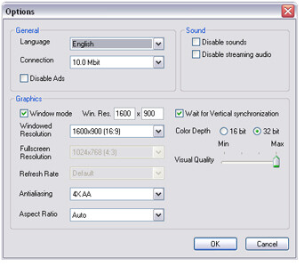 In the lower right area of the Client loader you will find an Options (read more below) button that allows access to the Options Panel where you can customize settings for your own computer and your participation in the Entropia Universe.