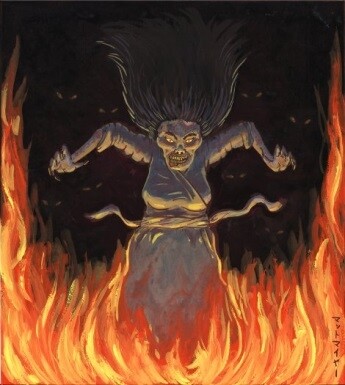 Izanami had been gone a very long time and Izanagi became worried about her. Breaking his promise, he lit his hair comb on fire and followed where he thought his wife had gone to. He found her, but she was not like she was when she left. She had become a rotting corpse covered in maggots. The eight thunder deities where consuming her body. Izanagi screamed, and Izanami woke from her death-like state. Seeing that Izanagi had not kept his promise, she became very angry and chased him out of the land of the dead. She did not try to return to the land of the living anymore.