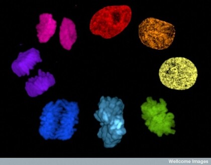Notice how the cycles of cell division quite neatly match the idea of the SevenSphere: although this photographed and colored-in collection of images from http://images.wellcome.ac.uk shows the eight states of cell division, we see that only six of them are actual single cell images. The remaining two are already a set of two, with identical DNA.